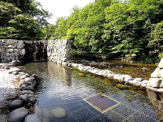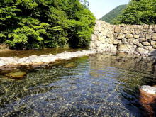 風呂は川石を積んだ長くてかなり大きなもので、横を流れる大畑川と一体になっている。
