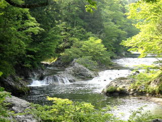 薬研温泉はブナやシラカバの原生林の中、ゆるやかな流れの清流で、新緑や紅葉の時期には見事な景観となる大畑川沿いに、旅館3軒だけが点在する小さな温泉地だ。