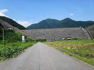 熱塩温泉から3kmほど、案内板に従って右折すると間もなく、平坦な野原の先の正面に巨大な日中ダム湖の堰堤が見えてきた。