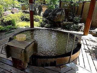 檜の円形風呂、かけ流しの飯森の湯だ。温めで長時間入浴が可能。他の方の写真で見かけた泡付は見られなかった。