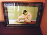 脱衣場手前のスペース(休憩用?)。何故かあまり上手くない女性のヌード油絵が額に入れられて床に置いてあった。