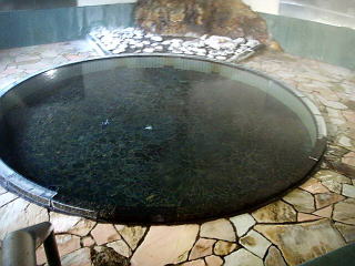 円形の混浴浴槽。宿では30人が一度に入浴出来るとしているが、それはムリだ。とにかく熱いので、ホースで水を入れて温度を下げた。
